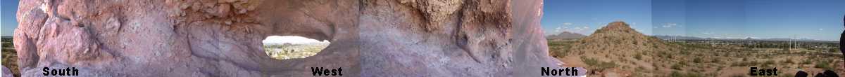 Take a look at the images on the right to get any idea of this. Once in a while a visitor is hurt or killed in a fall from the rock. The easiest way to get to the top is to go through the Hole, then around the front along the sides where the people are standing in the picture - the slope angle varies from 20-45 percent grade. One Saturday I sat and watch people come out of the Hole, cross the front cave and start to climb to the top. About two-thirds decided it was not a good idea and turned back. I also sent an email to the Phoenix City of Parks asking if they had an reliable statistics on injuries from falls, but they never responded. Anyway, be careful!